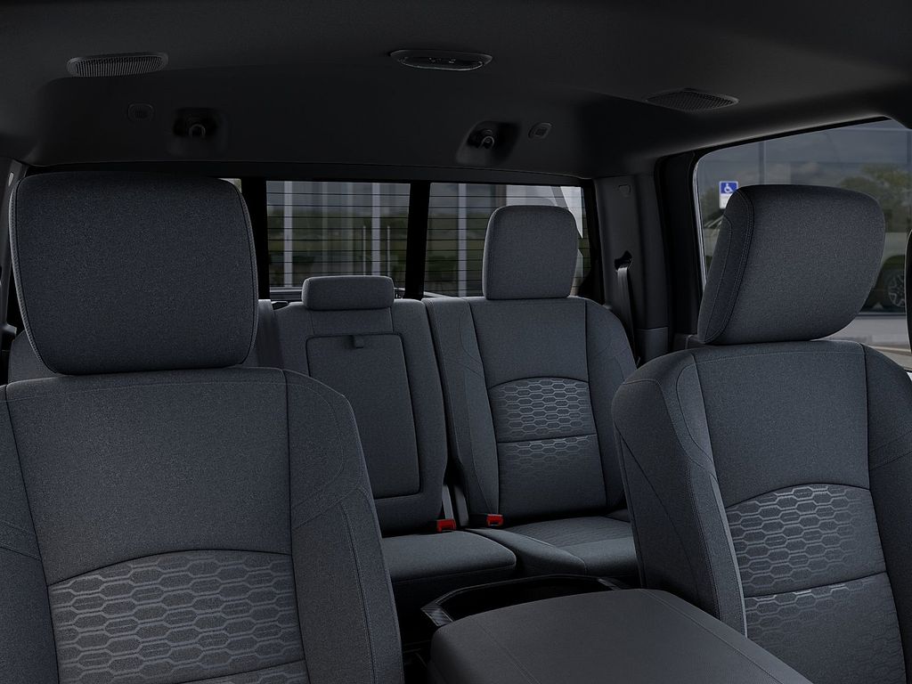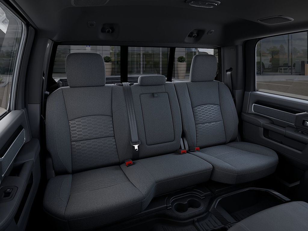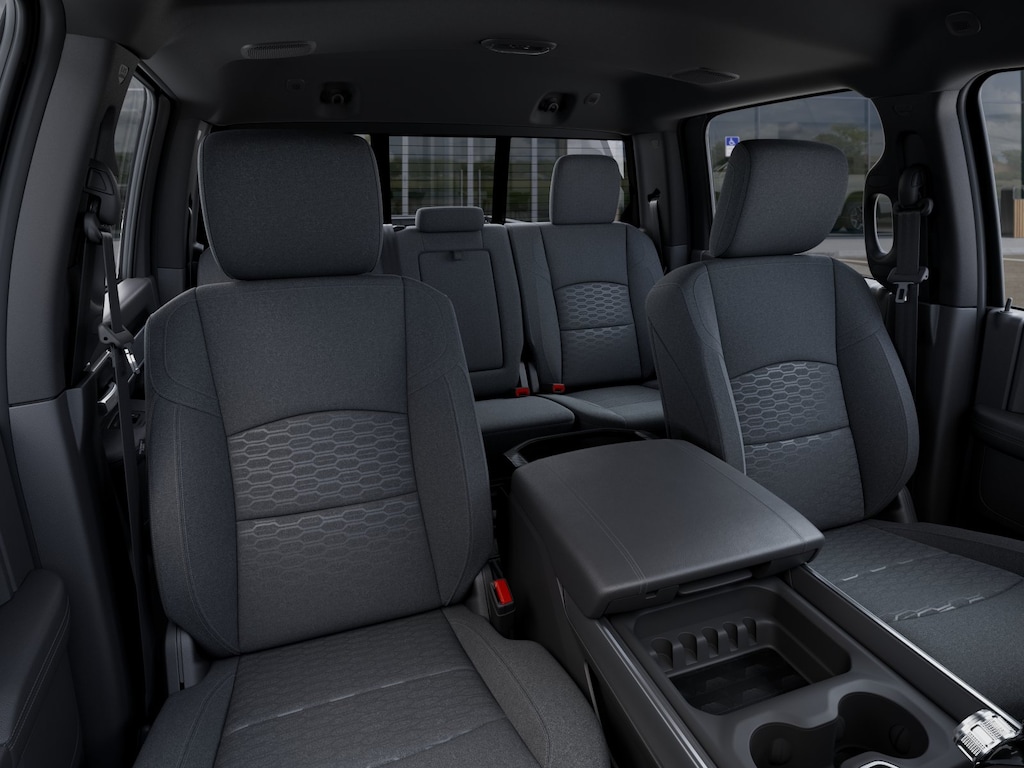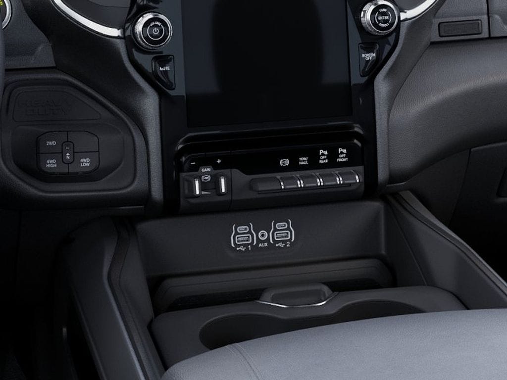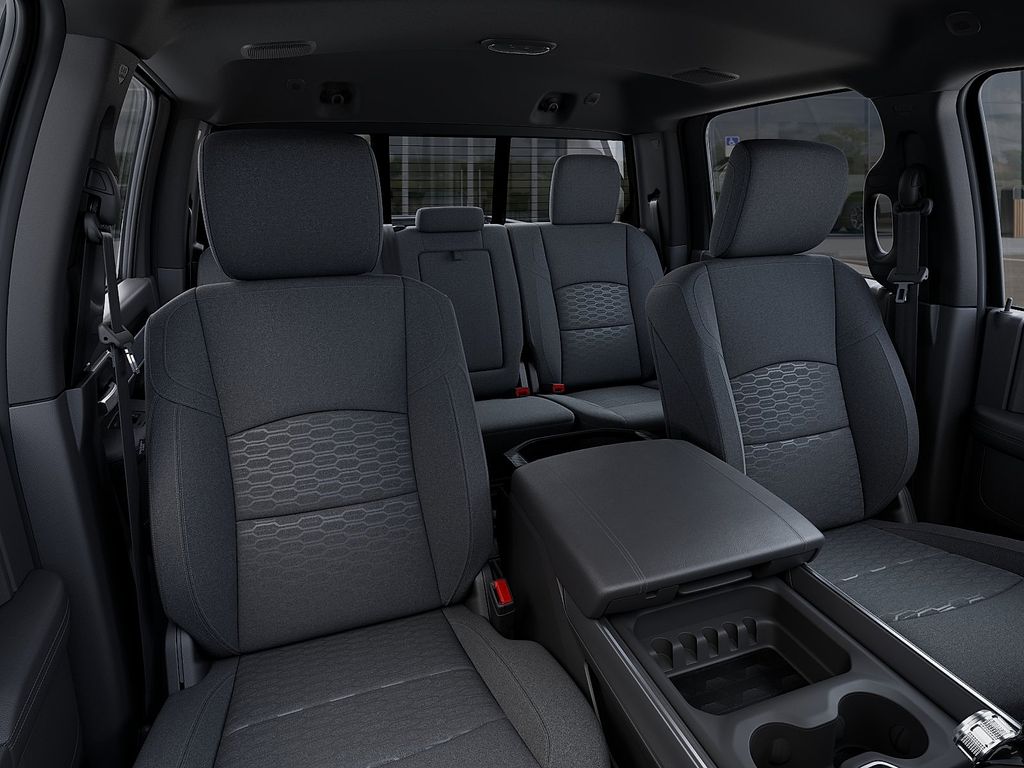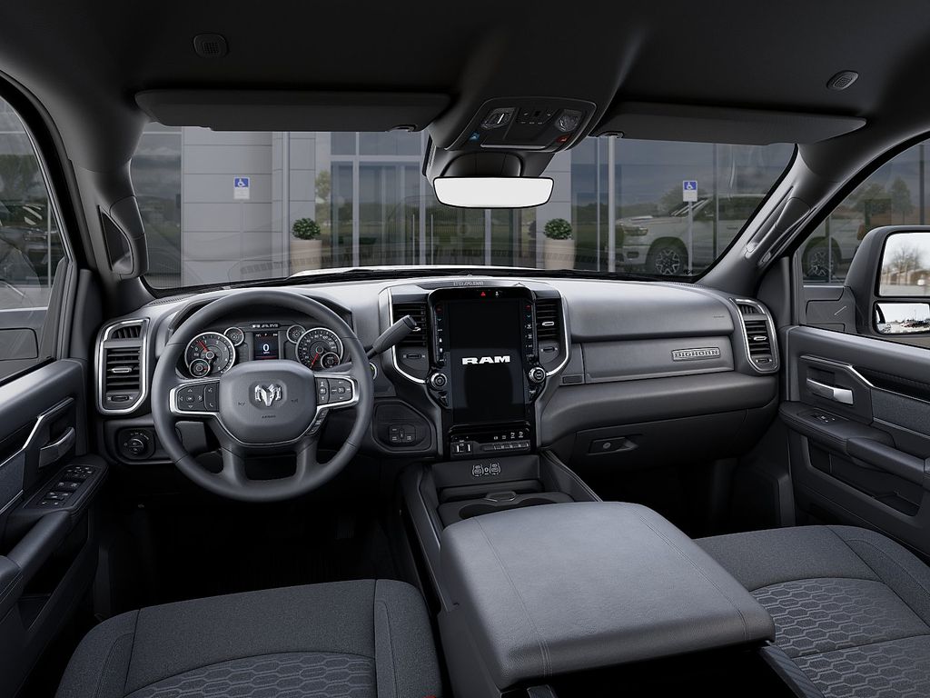 The exterior of the Big Horn shines in a sleek Granite Crystal Metallic Clearcoat, complemented by a host of premium features, including chrome flat wheel-to-wheel side steps, LED bed lighting, and a MOPAR spray-in bedliner. Step inside and you'll be greeted by a spacious and well-appointed cabin, featuring premium cloth bucket seats, a luxurious steering wheel, and dual-zone automatic climate control.